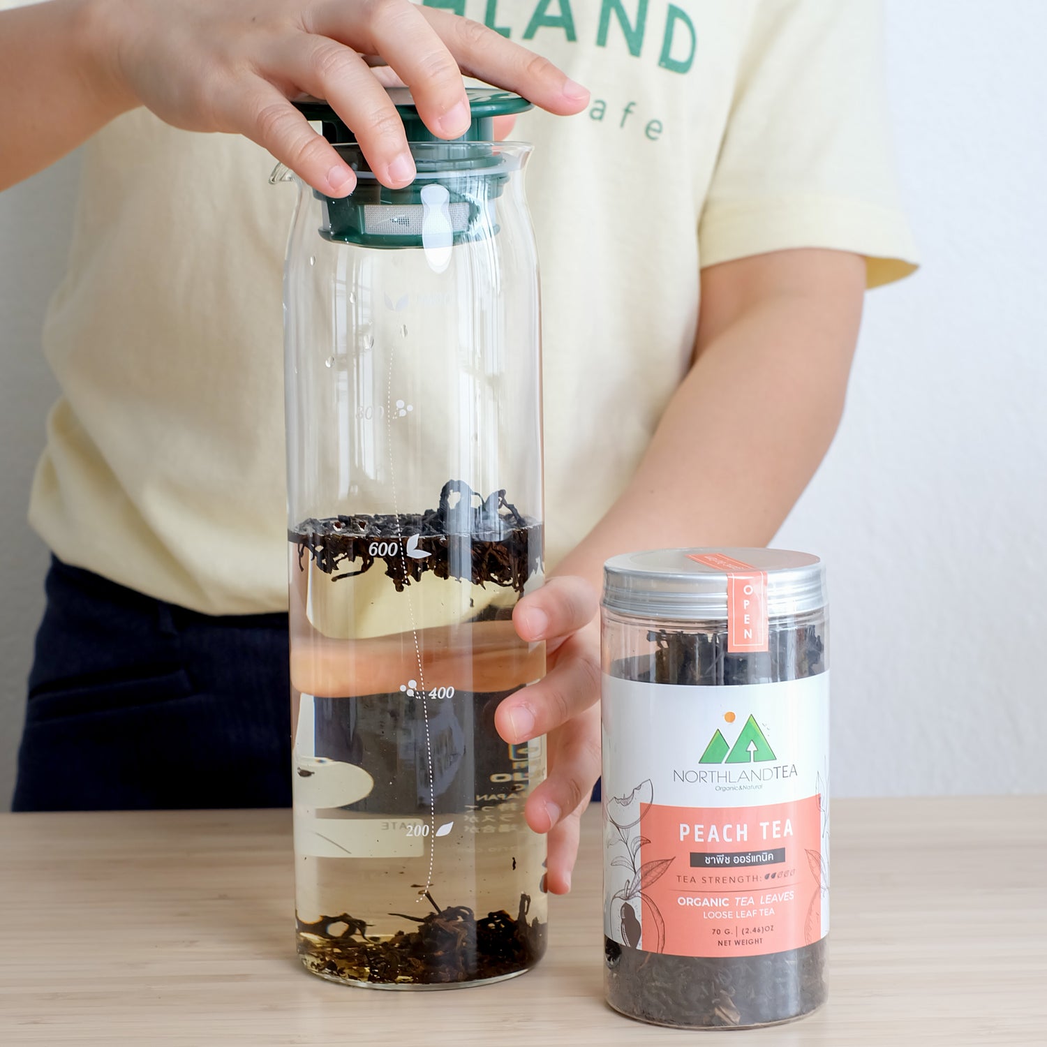 Pour cold or room temperature water and add loose-leaf tea to the cold-brew teapot.